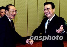 中共中央政治局常委、全國人大常委會委員長李鵬十六日在北京會見朝鮮最高人民會議常任委員會副委員長楊亨燮(左)。作者:鄭萍萍