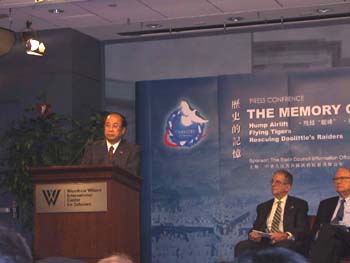 陳納德將軍的夫人陳香梅女士說,中美兩國人民應(yīng)當(dāng)永遠(yuǎn)是朋友,今天我們?cè)谝黄鹁拺严攘,追尋歷史,讓我們與先烈一樣,為了世界和平而共同努力。