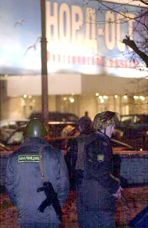 莫斯科時間23日晚間(北京時間24日凌晨),大約40-50名車臣武裝分子劫持了莫斯科市一家劇院,將700多人扣為人質(zhì),已經(jīng)釋放部分人質(zhì)。圖為警察在劇院外警戒。(春風)