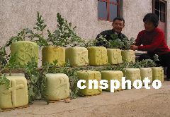 沂蒙山區(qū)費縣大田鄉(xiāng)黃土莊村青年農(nóng)民田榮芳是當(dāng)?shù)剡h近聞名的“沂蒙山西瓜王”,在十六大召開前他經(jīng)過反復(fù)試驗,終于培育出了長有“熱烈慶祝中國共產(chǎn)黨十六大勝利召開”字樣的16個正方形西瓜,每個重約16斤左右。代表了沂蒙老區(qū)農(nóng)民心向黨中央的、盼望著黨的十六大早日召開熱切心情。田榮芳高興地說:“俺正準(zhǔn)備把西瓜運往北京,獻給黨中央、獻給十六大!”王樹芳、潘振宇 攝