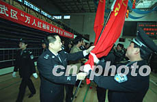 為迎接中共十六大,十一月一日全市八個城區的七十萬治安保衛人員走上街頭,維護治安秩序,預防各類案件及災害事故的發生。圖為北京宣武警方為此舉行了隆重的授旗儀式。作者:任海霞
