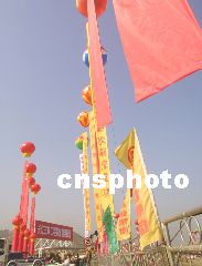 在長江三峽工程導流明渠截流現場,五日已搭建好截流儀式會場,六日將從這里發布合龍命令。
