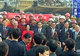 截流儀式結束后,中央領導一行離開主席臺,走到上游圍堰,接見三峽建設者并與建設者代表合影。