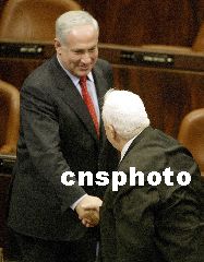 11月6日,內塔尼亞胡正式就任沙龍重新組閣后的以色列新內閣外長。圖為內塔尼亞胡在宣誓就職后,與總理沙龍握手致意。Ic/cnsphoto 攝