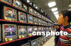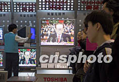 中共十六大十一月八日清晨在北京開幕,北京市民在商場觀看開幕式。張宇 攝