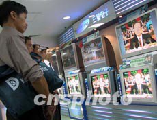 中共十六大八日在北京隆重召開,福州一家商場內聚集了眾多觀看開幕式電視直播的市民。作者:劉可耕
