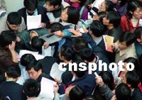 于1999年首次擴招的大學生,明年將面臨就業。2003年作為我國第一個畢業生高峰年,應屆畢業生達到212萬人,比2002年增加67萬人,增幅45%,而社會需求則并未增加。隨著21日畢業生就業工作正式開始,首批擴招大學生將面臨嚴峻的就業競爭形勢。圖為23日在上海舉行的應屆畢業生洽談會上,場面火爆,現場招聘人員“手”不暇接。李江松 攝
