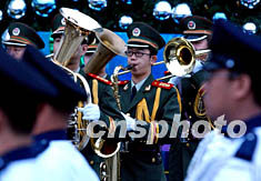 圖:中國武警軍樂團與香港警察樂隊合作升旗