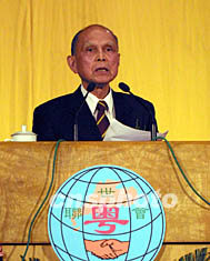 全國政協副主席霍英東在大會上致辭。作者:羅仰明
