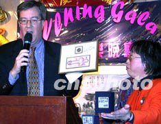 加拿大首都渥太華唐人街將建具有中國特色的小公園“世紀園”。籌款委員會本月二日在渥太華舉行首次籌款拍賣晚宴,募得八千余加元。準備競選下任總理的加拿大前財政部長寶羅·馬田(Paul Martin)簽名捐出面值兩加元的紀念紙幣和硬幣,拍賣得到五百加元。一九九五年,馬田任職財政部長期間,將加拿大兩元紙幣永久性變成硬幣。圖為加拿大旅游局總裁吉姆.沃森(Jim Watson)展示紀念幣拍賣品。作者:蒲力