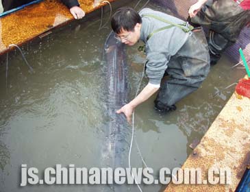 據介紹,白鱘是漁民孫永來昨天下午二時左右在長江下關潛洲以北的江面上捕捉到的。孫永來花費一個多小時將白鱘拖運到一千五百米處的漁政碼頭。