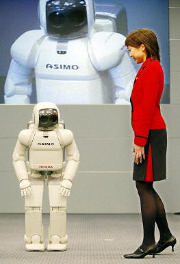 本田汽車公司在東京總部展示了具有人形特質的代號“ASIMO”的機器人,該種新型“ASIMO”機器人與示范小姐作出各種互動回應,識別接近它的人,跟隨她,按照指示方向移動。