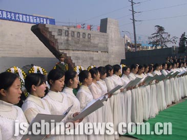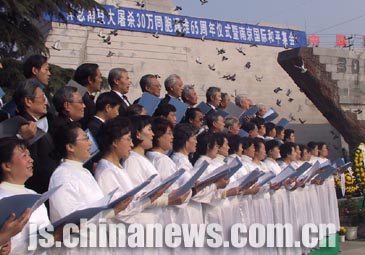 中新江蘇網12月13日電 (記者 王國安)今天上午,侵華日軍南京大屠殺遇難同胞紀念館的悼念廣場上響起“和平之聲”——在這里參加“悼念南京大屠殺三十萬同胞遇難六十五周年儀式暨南京國際和平集會”的三千名各界人士齊聲高唱《五月的鮮花》、《紫金草,和平的花》、《和平頌》,用歌聲表達了呼喚和平、維護和平、熱愛和平、促進發展的強烈愿望。