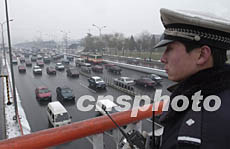 十五日,北京遭遇今冬第一場雪。為防止出現類似去年“一二·七”交通大擁堵的情況,北京交警在重點路段加強巡邏。作者:張煒