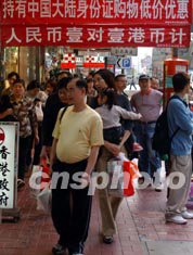 圣誕來臨,香港商家屢出高招攬內地客生意,圖為銅鑼灣附近的商家打出人民幣與港幣等值的消費標語以吸引內地客消費。潘索菲 攝