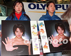 香港歌星梁詠琪今年在北京成為奧林巴斯商家代言人。二十九日,兩位北京小姐在翠微商廈手捧梁詠琪的兩幅細微差異肖像請顧客辨認,優(yōu)勝者可以獲獎。作者:鄒憲