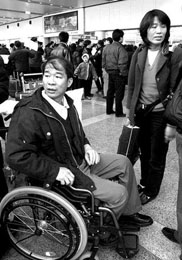 昨天下午5點(diǎn)40分。首都國(guó)際機(jī)場(chǎng)國(guó)際到港出口處。在推著大包小包行李的人流中,一個(gè)頭發(fā)稀疏的中年男子坐在輪椅上被緩緩?fù)瞥觥K褪窃?002年4月12日以色列耶路撒冷爆炸案中受傷的中國(guó)勞工林金謀。