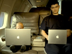 在廣告中,身高2.26米的姚明與主演電影《Mini Me》的小個子維恩·特洛耶一起搭乘噴氣式客機旅行。姚明在座位上抽出固定的電腦顯示屏,而維恩·特洛耶則拿出他自己的Power Book G4,不同的是,特洛耶的筆記本電腦擁有17寸的大屏幕,他樂滋滋地看起了《臥虎藏龍》。大個子姚明看著自己的小屏幕,再看看小個子特洛耶的大屏幕,羨慕之余又有點忍俊不禁,最后兩人會意地相視而笑。