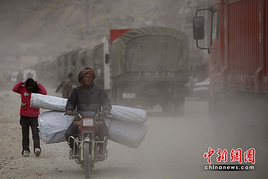 青海玉樹地震:領取救災物品的受災民眾行走在塵土中