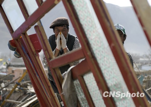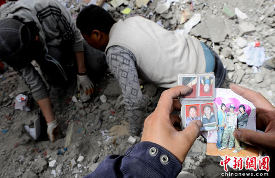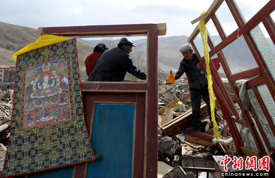 玉樹地震災(zāi)民清理廢墟中的法器