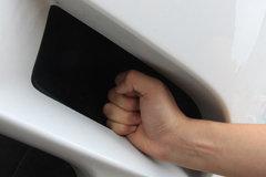 面積寬大的前保險杠上四個前側探頭一字排開,下面的進氣格柵采用蜂窩網狀,車型定位運動的身份暴露無遺。底邊兩側原本應該是被霧燈雄霸的區域,M3把這部分處理為黑色進氣口,前輪剎車片散熱勤懇服務,一拳的高度可見它一定擁有很好的胃口。