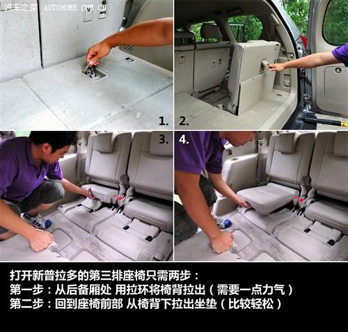 在打開第三排座椅的情況下,普拉多后備廂的儲物空間已經近乎于零了,所以滿載7人之后,應該趕快把第三排座椅收回去,不會?請看上圖。收起第三排座椅同樣是兩步,先摳起座椅旁邊的機關,椅墊就可以自動收回了,然后再摳起椅背上的開關,放倒椅背就可以恢復如初了。