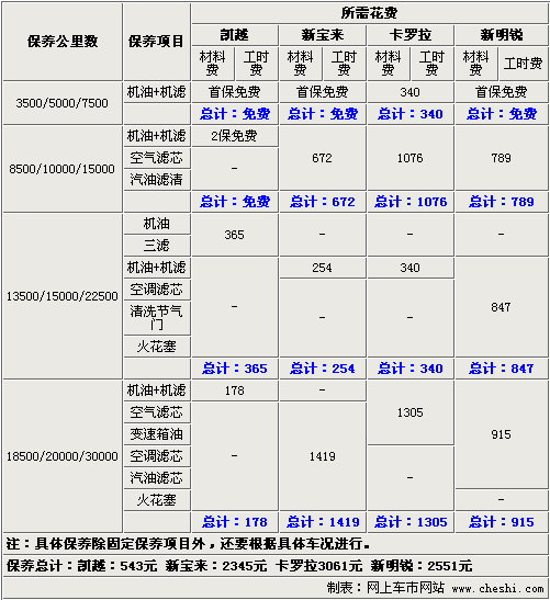 別克新凱越首保時(shí)間是四款車(chē)型中最短的,但廠家提供前兩次免費(fèi)保養(yǎng),這點(diǎn)看來(lái)還比較貼心。18500公里結(jié)算后,543元的總保養(yǎng)金額是四款車(chē)中最少的一個(gè)。新寶來(lái)和新明銳同為大眾品牌下車(chē)型,但由于合作商不同,保養(yǎng)的費(fèi)用還是存在一些細(xì)微的差距,都在2600元范圍內(nèi)。日系車(chē)一貫是經(jīng)濟(jì)實(shí)惠見(jiàn)長(zhǎng),但在后期保養(yǎng)的方面豐田卡羅拉的費(fèi)用卻是四款車(chē)中最高的,超過(guò)3000元的數(shù)字也是新凱越保養(yǎng)費(fèi)用的5倍多。