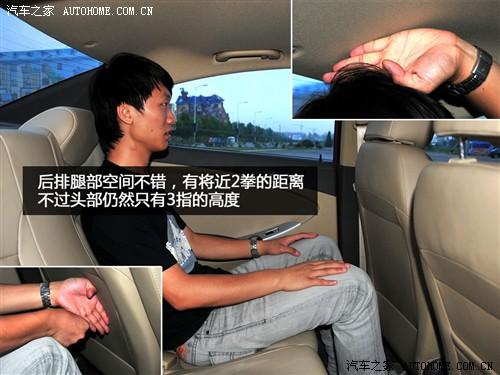 圖中的體驗著身高175cm左右,在調整好合適的坐姿之后,前排頭部只有三指,而后排也僅僅3指,所以這點證明了流線型的車身線條還是會給頭部一些小的影響。當然,超長的軸距直接帶來了腿部空間的提升,作為小型車來說后排能達到兩拳的長度確實不多見。