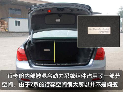 在外觀部分的辨識性上,混合動力7系轎車采用了唯一的海藍色漆面噴涂。配合分布在車身側面、車尾的“Active HyBrid 7”字樣,讓大家很容易就能夠看出這是一臺與眾不同的寶馬7系轎車。而由于電池組的關系這臺7系混合動力車型的行李空間也有所減少,但是相對于7系轎車充足而寬大的后備箱容積來說減少的部分不會為實際的使用泰來太多的不便。