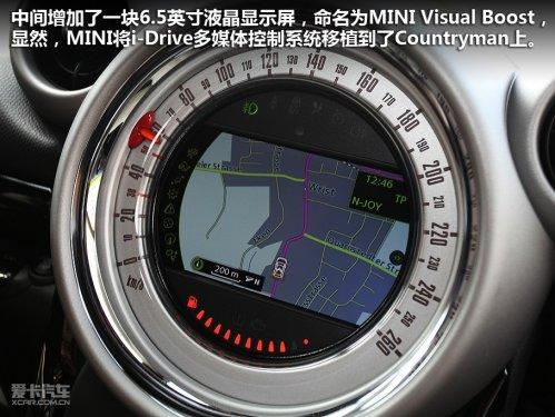 不用想,中控臺上最大的那個時速表肯定會成為視覺焦點,原因之一是時速表與兩側的空調出風口連為一體,簡直就是個米老鼠頭像,可愛至極。原因之二是這個時速表中間增加了一塊6.5英寸液晶顯示屏,顯然,MINI將東家的i-Drive多媒體控制系統移植到了Countryman上,命名為MINIVisual Boost,只是沒有寶馬上那個顯眼的控制旋鈕,在MINI上這個旋鈕被放在了換擋底座的后方,使用上還算順手,只是造型比較簡化,但同樣擁有兩個直觀的快捷鍵。