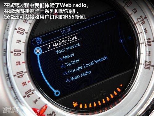這套系統中整合了GPS導航、音響多媒體、車輛信息設置等諸多功能,最有特點的是其中MINIConnected這項功能,有了這套系統,你可以將自己的蘋果iphone放入中央扶手,并與整套車載系統連接,可以延伸出更多的拓展功能,在試駕過程中我們體驗了Web radio、谷歌地圖搜索等一系列創新功能,據說還可以接收用戶訂閱的RSS新聞。目前這套系統是否會裝備在進入國內的MINICountryman上我們還不得而知,但相信這種集成式的多媒體系統會是今后的發展趨勢。