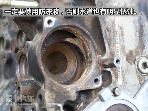 長期使用水而不使用防凍液會腐蝕水泵葉輪,尤其是金屬葉輪腐蝕最為嚴重。此外,水箱也會被水垢腐蝕造成管路堵塞,圖上這個腐蝕的情況是一般情況,更為嚴重的是葉輪已經徹底被腐蝕掉,散熱系統降低造成水溫過高而經常開鍋。