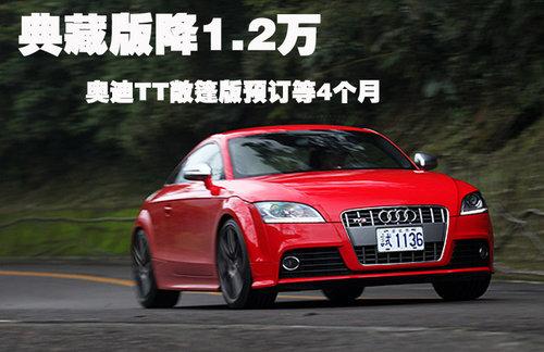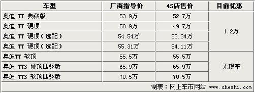 據(jù)4S店銷售人員介紹:目前奧迪TT已上市的典藏版車型店 內(nèi)有現(xiàn)車,售價為53.9萬元,TT標(biāo)準(zhǔn)版車型有現(xiàn)車,售50.9萬元,但還有2款在50.9萬元基本款車型上增配車型,分別售54.54萬及55.31 萬,以上這4款車型都可優(yōu)惠1.2萬元,車身顏色共有白色、紅色、銀色及日光橙色供挑選。奧迪TT典藏版相對在售TT車型不同的是,這款車配以橘色車身及 運(yùn)動套件,車內(nèi)車外都進(jìn)行運(yùn)動改裝,看起來十分漂亮。如需預(yù)定TT及TTS其他顏色及車款,需等待4-6個月時間,由于是按照車主需求定制車型,所以等待時間較長。