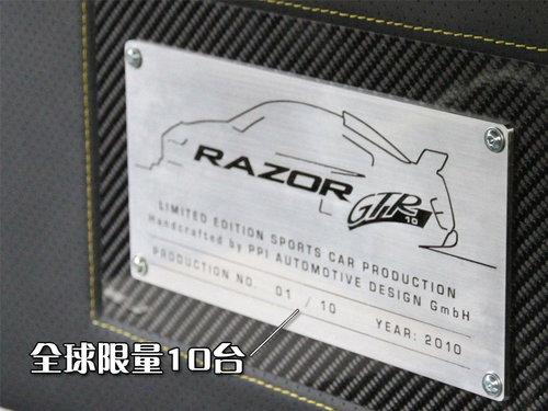 PPI打造的改裝版R8命名為RAZOR GTR-10,這個名字中的10意味只限量改裝10臺。RAZOR GTR-10是一款高性能全碳纖維輕量化超級跑車,前臉換裝了巨大的碳纖維運動前保險杠,完美的運用了空氣動力學并通過了風洞測試。前備箱蓋一側有兩條金色賽道紋貫穿車身前后。