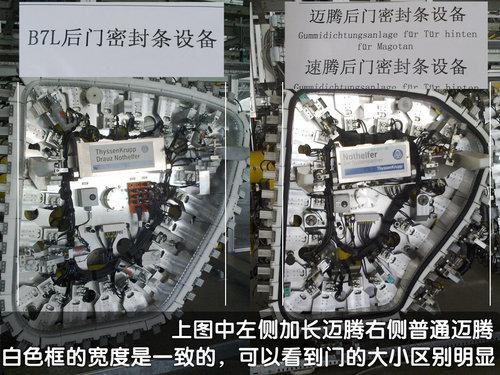 在一汽大眾位于長(zhǎng)春的二廠生產(chǎn)線上記者也確實(shí)看到了寫(xiě)有“B7L”字樣的車(chē)門(mén)試裝區(qū)域。從車(chē)門(mén)的“夾具”來(lái)看,普通的邁騰(B6)與加長(zhǎng)后的邁騰(B7L),在門(mén)的大小上有非常明顯的區(qū)別,并且我們從工作人員那里也獲得了B7L是加長(zhǎng)邁騰的肯定答案。