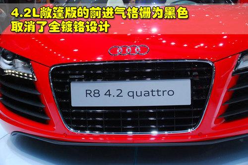 奧迪R8 4.2L敞篷版與5.2L車(chē)型一樣,都采用了輕量化軟頂設(shè)計(jì),當(dāng)頂棚全部敞開(kāi)時(shí),讓原本激進(jìn)低俯的外觀更加拉風(fēng)。奧迪R8 4.2L敞篷版的頂篷采用電子液壓控制,在車(chē)輛時(shí)速50公里或以下時(shí)頂篷可以在19秒內(nèi)打開(kāi)或收起。后車(chē)窗從頂部向兩邊分開(kāi),這可以讓頂篷完全獨(dú)立的打開(kāi)。