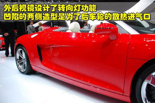 奧迪R8 4.2L敞篷版的外后視鏡也設(shè)計(jì)了轉(zhuǎn)向燈功能,而且逐步凹陷的兩側(cè)車(chē)身造型是為了后車(chē)輪的散熱進(jìn)氣口而設(shè)計(jì),而且也非常符合空氣動(dòng)力學(xué)原理。奧迪R8 4.2L敞篷版配備了19英寸運(yùn)動(dòng)型輪轂,采用超低扁平比輪胎和通風(fēng)剎車(chē)盤(pán),可以提高車(chē)輛的抓地力和制動(dòng)效果。奧迪R8 4.2L敞篷版車(chē)身大多采用鋁制金屬材料,作為一款中置發(fā)動(dòng)機(jī)產(chǎn)品,巨大的掀背門(mén)下面隱藏著強(qiáng)勁的引擎,并且表面還設(shè)計(jì)了很多散熱進(jìn)口。