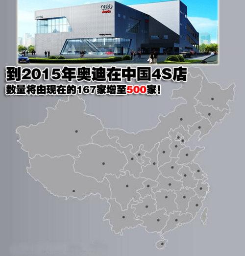 奧迪在國內(nèi)的熱銷使得現(xiàn)有的經(jīng)銷商在數(shù)量方面已經(jīng)不能滿足日益發(fā)展的需要,為了更好的為客戶服務(wù),奧迪在未來將持續(xù)提升經(jīng)銷商網(wǎng)絡(luò)的數(shù)量和質(zhì)量。預(yù)計到2015年,奧迪在國內(nèi)的經(jīng)銷商數(shù)量將從目前的167家上升到500家,覆蓋大部分中國主要城市,讓客戶更便捷的能享受到周到的服務(wù)。