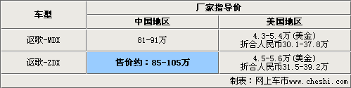 謳歌SUV車型MDX和謳歌跨界車ZDX同屬于一個級別的車型,它們的軸距都是2750mm。但是謳歌ZDX的車身要比MDX長,而身高度則低于MDX,這樣的設(shè)計(jì)完全符合跨界車(運(yùn)動型多功能跑車)的定位。目前謳歌MDX在中國地區(qū)的售價為81-91萬,通過謳歌MDX在美國地區(qū)的售價,我們預(yù)計(jì)謳歌ZDX引入中國地區(qū)的售價約為85-105萬(謳歌ZDX目前美國地區(qū)的指導(dǎo)價為4.5-5.6萬美金,折合人民幣為31.5-39.2萬元)。