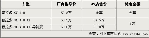 普拉多是一款大尺寸的SUV,皮實的外觀和超強的越野性能一直備受消費者的歡迎,但是普拉多產量并不多,市場上現車的數量非常少,同時各經銷商引入的車型也有相應差別。根據網上車市價格監測系統顯示,目前普拉多只有4.0排量車型有部分現車,數量有限,車源比較緊張,具體行情如下: