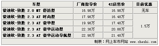 據4S店銷售人員介紹:目前蒙迪歐致勝全系優惠1.5萬元,現車較充足,但顏色不是非常齊全,只有銀色、灰色、黑色現車。如預定需等10天至20天左右,現車到店時間較短。2.0車型目前不接受預訂,廠家不給予排產,2.3升至尊版車型目前也已停產,請用戶根據自己的需求選擇車輛。
