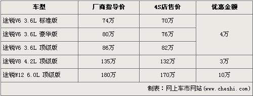 途銳是大眾首款引進我國的SUV車型,在3.6L及4.2L率先上市后,大眾為了滿足消費者的更大胃口,緊接著又推出了搭載12缸發(fā)動機的6.0L車型。隨著大排量消費稅的頒布,給9月份后入關的大排量車型帶來了一次不小的沖擊,令大排量汽車價格都上調了不少,大眾途銳6.0L頂級版也從原來158萬元的價格上調至了180元。近日據網上車市價格系統(tǒng)監(jiān)測顯示,大眾途銳全系的最高優(yōu)惠達到了10萬元,具體詳情請看下表: