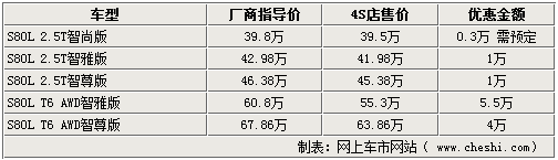 據(jù)4S店銷售人員介紹,目前國產(chǎn)S80L全系智尚版沒有現(xiàn)車供應(yīng),需要消費者訂車,訂金為5萬元。除優(yōu)惠5.5萬的T6智雅版外,其它幾款車也可以分別優(yōu)惠1萬到4萬元不等,到店詳談還可以有更多的優(yōu)惠。