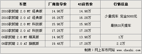 據(jù)東風(fēng)雪鐵龍銷售人員介紹,2010款凱旋目前沒有任何優(yōu)惠,車型顏色也不太齊全,預(yù)訂訂金為5000元,最快20天可提車。另外08款凱旋還有少量現(xiàn)車低價甩貨,最高優(yōu)惠幅度為2.2萬元左右,顏色以黑色、銀色為主。北京地區(qū)各4S店由于訂單不同,各店銷售的現(xiàn)車顏色有所不同。