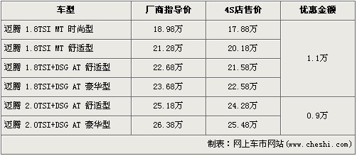 邁騰是一汽大眾主打中級車市場的車型,自上市以來一直受到了好評。今年3月份搭載DSG雙離合變速器的全新邁騰上市,缸內直噴發動機匹配DSG雙離合變速器的完美結合另邁騰再一次的成為了焦點。近日據網上車市價格系統監測顯示,邁騰全系最高優惠1.1萬元,具體價格詳情請看下表: