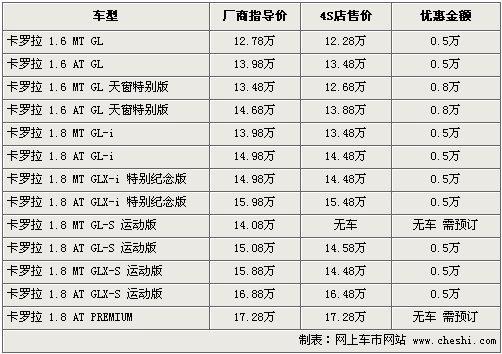 筆者目前了解,卡羅拉新推出的1.6天窗特別版車型目前有現車供應,但高配紀念版和運動版車型現車仍然供應比較緊張,需要消費者預訂。目前天窗特別版車型最高可優惠現金8000元,其他車型可優惠5000元左右。全系十多款車型中,1.6天窗特別版相比性價比較高,消費者可以考慮購買。