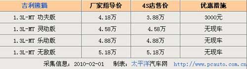 近日,筆者從北京吉利4S店了解到,目前該車的優(yōu)惠幅度比較穩(wěn)定,手動擋車型功夫版外均有4000元的現金優(yōu)惠,但現車方面僅有功夫版車型有少量現車,有意向購買的消費者可要抓緊了。詳情請見下表: