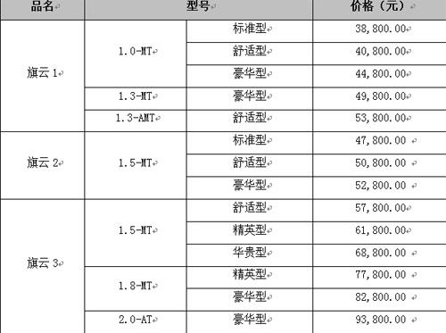 整合后的旗云品牌將面對大眾消費者,以“務實、家庭、信賴”為品牌內涵,為消費者提供可以輕松擁有、值得信賴的汽車產品,現階段主要包括旗云1、旗云2和旗云3三款產品,分別在A0級、A級、A+級三大市場中豎立“空間、節能、性價比”新標桿。同時在未來,旗云品牌將進一步豐富產品線和品牌內涵,從而滿足國內汽車市場差異化的需求。