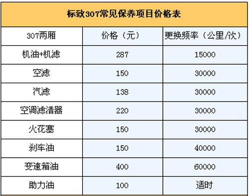 5.保養(yǎng)費: 我們向標致4S店售后服務人員咨詢過,他們說307一大優(yōu)勢是保養(yǎng)周期比較長,1.5萬公里才需要保養(yǎng)一次,是同級車型中保養(yǎng)花費最低的。通常新車首保在7500公里時進行,以后每1.5公里保養(yǎng)一次。第二次1.5萬公里時的常規(guī)保養(yǎng)(更換機油機濾)需花費287元;3萬公里保養(yǎng)(更換機油機濾+空濾+空調濾芯+汽濾+火花塞)為795元;4.5萬公里保養(yǎng)(更換機油機濾)花費287元;6萬公里保養(yǎng)(更換機油機濾+空濾+空調濾芯+汽濾+火花塞)為795元。