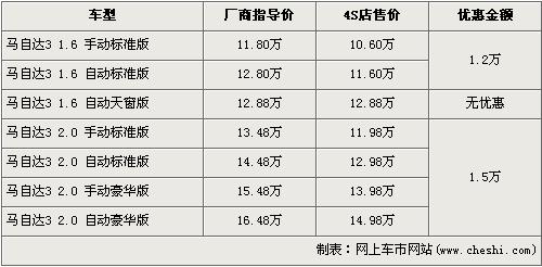 長安馬自達旗下主力車型馬自達3以1.6L車型于06年開場,隨后又為車系注入了2.0L車型,2年時間馬3憑借動感的外觀以及優越的性能博得了消費者的喜愛。今年的4月2日長安馬自達又為消費者帶來了1.6L的自動天窗版車型,豐富了馬3的銷售車型。據了解,近期購買馬自達3的消費者可以得到最高1.5萬元的優惠,具體詳情請看下表: